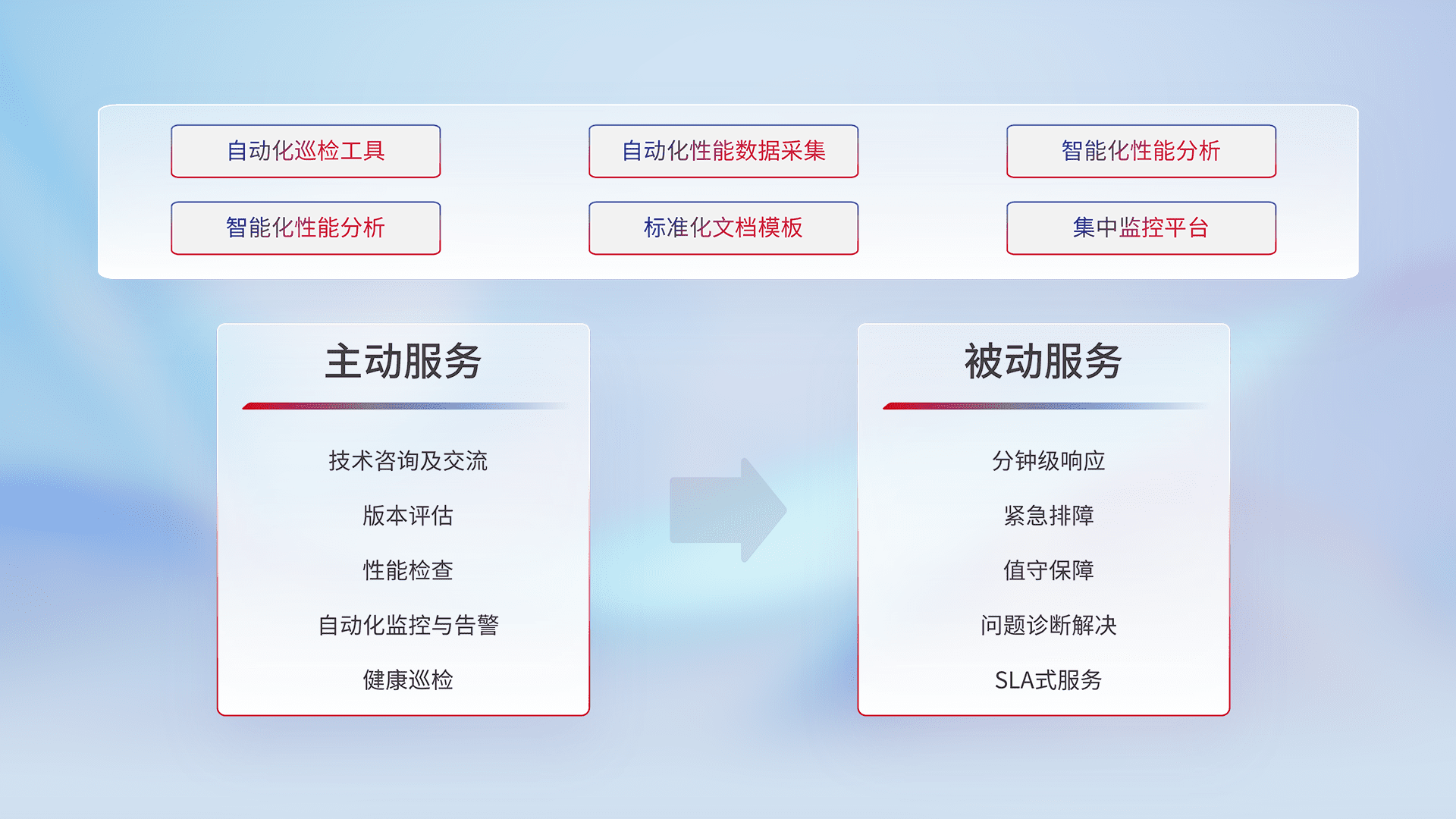 智能化工具和标准化文档,,,保障服务质量,,,,提供主动服务(包含技术咨询、、版本评估、、、、性能检查、、自动化监控与告警、、、健康巡检)和被动服务包含(分钟级响应、、、、紧急排障、、、值守保障、、问题诊断解决、、SLA服务)。。。